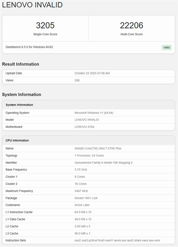 GeekBench里已经可以看到第一款ARL-R处理器,型号命名为“酷睿Ultra 7 270K Plus”,来自一台联想整机。