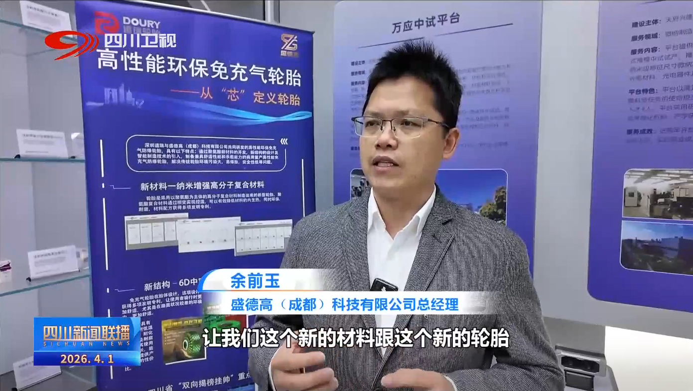 盛德高(成都)科技有限公司总经理 余前玉:目前我们接受的订单已经上亿了,通过这个科创生态岛的这个中试平台去链接产业链,让我们这个新的材料跟这个新的轮胎快速地进入这个市场化。我们的计划是在 2027年实现大概在1.5万平方的一个生产基地,快速去进入市场交付。
