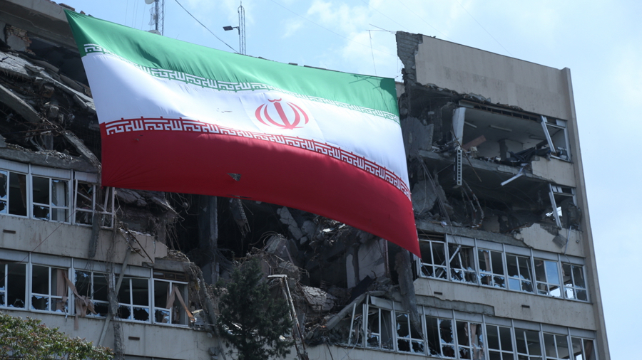 4月20日,在伊朗首都德黑兰,伊朗国旗悬挂在遭美以袭击被严重损毁的建筑上。\n 新华社发