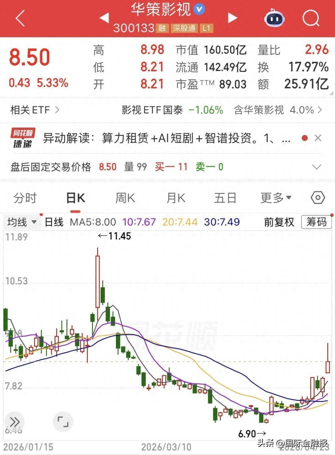 4月23日,华策影视逆势上涨,盘中涨幅一度超过11%,截至收盘,报8.50元/股,涨5.33%。
